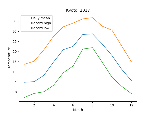 例として2017年の京都の月別平均気温のプロットをしてみましょう。 左から月、日平均気温、日最高気温、最低気温です。