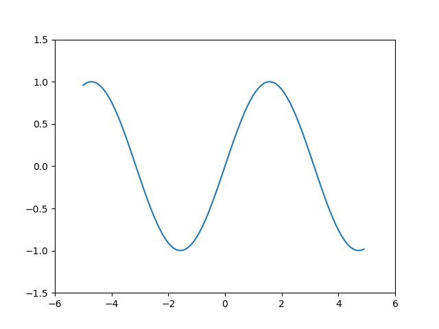import numpy as np import matplotlib.pyplot as plt x = np.arange(-5, 5, 0.1) y = np.sin(x) plt.plot(x, y) plt.xticks(np.arange(-6,6,2)) plt.yticks(np.arange(-1.5,1.5,0.5)) plt.xlim(-5,5) plt.ylim(-1.2,1.2) plt.show()