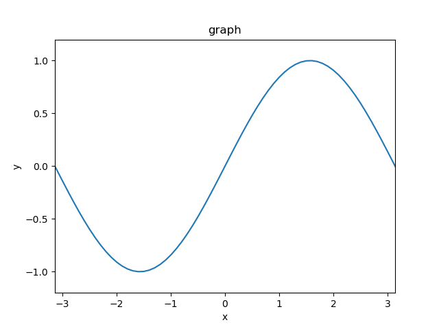 import numpy as np import matplotlib.pyplot as plt x = np.arange(-5, 5, 0.1) y = np.sin(x) plt.title("graph") # グラフのタイトル plt.xlabel("x") # x軸(横軸)のラベル plt.ylabel("y") # y軸(縦軸)のラベル plt.plot(x, y) plt.xlim(-np.pi, np.pi) plt.ylim(-1.2, 1.2) plt.show()