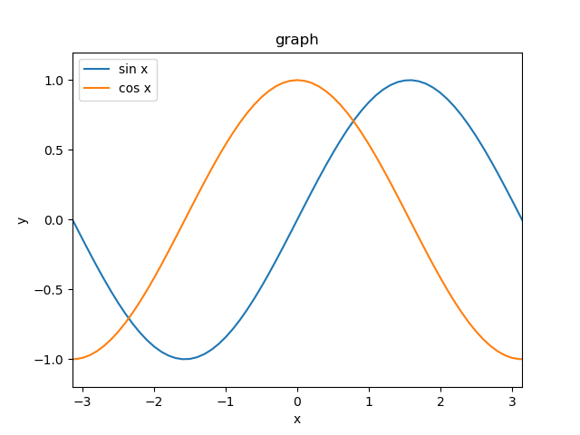import numpy as np import matplotlib.pyplot as plt x = np.arange(-5, 5, 0.1) y1 = np.sin(x) y2 = np.cos(x) plt.title("graph") plt.xlabel("x") plt.ylabel("y") plt.plot(x, y1, label="sin x") # labelに凡例に表示する文字を指定 plt.plot(x, y2, label="cos x") plt.legend() # 凡例を表示 plt.xlim(-np.pi, np.pi) plt.ylim(-1.2, 1.2) plt.show()