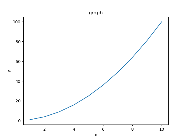 import numpy as np import matplotlib.pyplot as plt x = [1,2,3, 4, 5, 6, 7, 8, 9, 10] # データのx成分 y = [1,4,9,16,25,36,49,64,81,100] # データのy成分 plt.title("graph") plt.xlabel("x") plt.ylabel("y") plt.plot(x, y) plt.show()