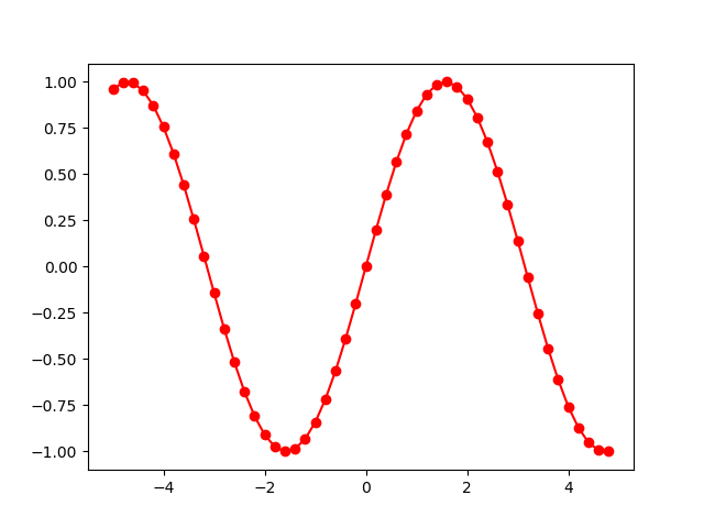 import numpy as np import matplotlib.pyplot as plt x = np.arange(-5, 5, 0.2) y = np.sin(x) plt.plot(x, y, "-or") plt.savefig("line.png")