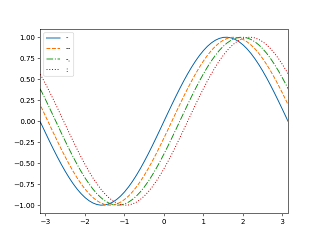 import numpy as np import matplotlib.pyplot as plt x = np.arange(-5, 5, 0.1) y = np.sin(x) plt.plot(x, y, "-", label="-") plt.plot(x+0.2, y, "--", label="--") plt.plot(x+0.4, y, "-.", label="-.") plt.plot(x+0.6, y, ":", label=":") plt.legend() plt.xlim(-np.pi, np.pi) plt.savefig("lines.png")